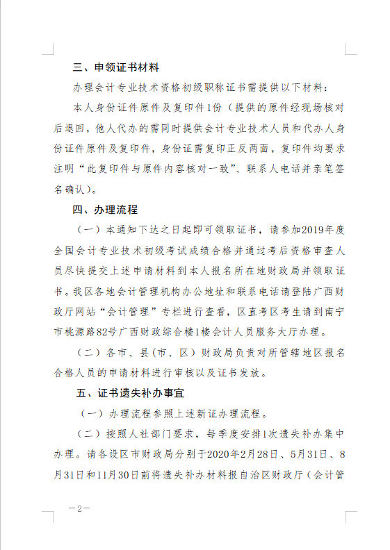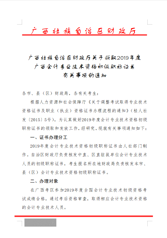 广西壮族自治区财政厅关于领取2019年度广西会计专业技术资格初级职称证书有关事项的通知