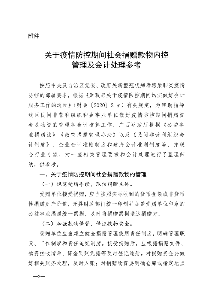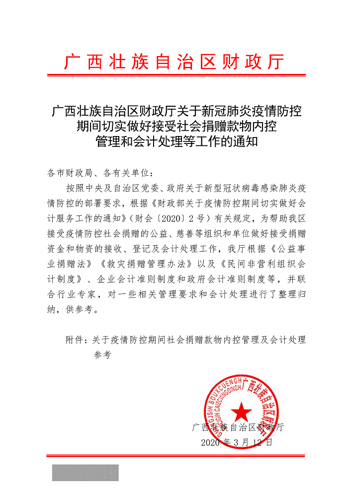 广西壮族自治区财政厅关于新冠肺炎疫情防控期间切实做好接受社会捐赠款物内控管理和会计处理等工作的通知